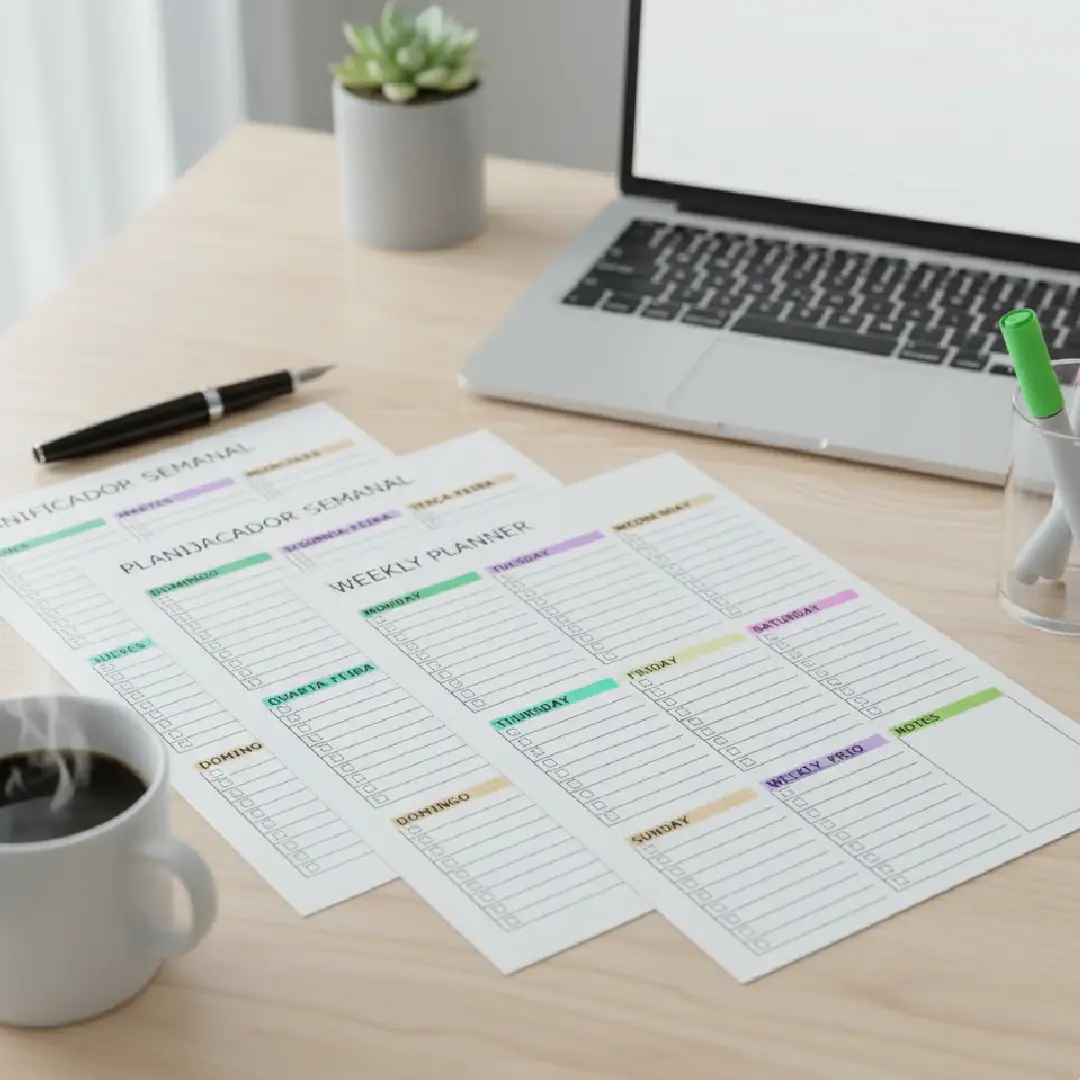 Planificador Semanal Hojas Imprimibles en Español, Ingles y Portugues